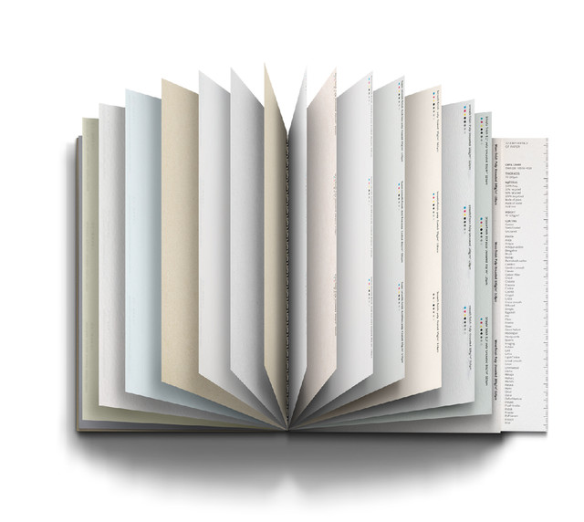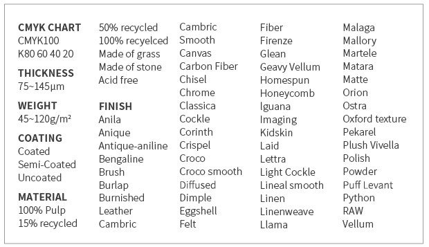 另外,每一張紙都有詳細資料,包括紙張的重量、厚度、原材料等等。還有CMYK的樣版,讓用家知道在這款紙張上印刷的色樣。如果用家在工作上需要討論印刷的事宜,就可以把筆記旁邊的CMYK的樣版撕下來,讓客戶或同事直接感受紙張的材質。