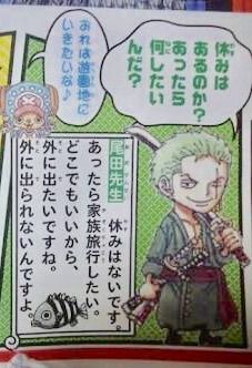 ▼尾田老師曾在訪問中訪題表示完全沒有休息的時間,可以的話很想跟家人去旅行,哪裡都可以,只要可以去外面就好,很久沒有外出。