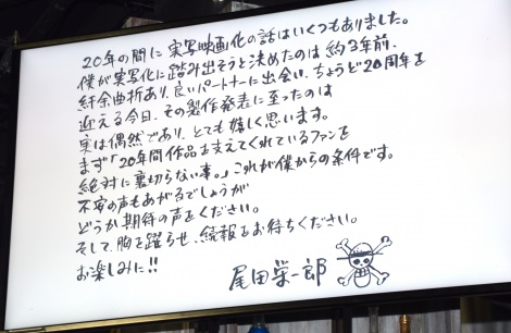 原著作者尾田榮一郎對此表示相當興奮,「不能愧對支持了20年的粉絲,這是我對製作真人版的條件!」。看來今次真人版尾田亦會親身監修,到底今次荷里活再次翻拍日本動漫作品成品如何?就要拭目以待。