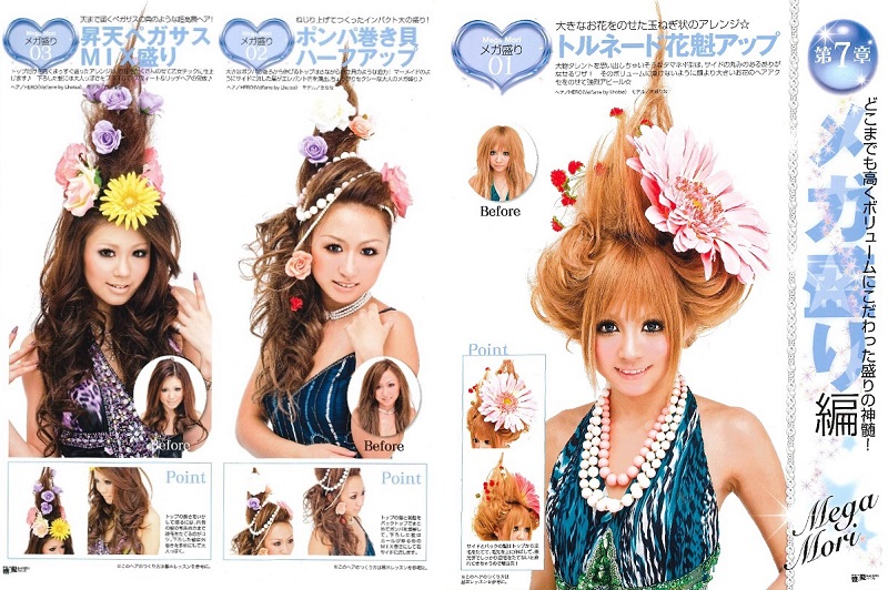 約十年前,髮型目錄出現了一款前衛的髮型「昇天ペガサスMIX盛り」,中文可譯做飛天獨角獸MIX髮型。具體來說,就是蓬鬆髮型的究極形態,把頭髮像獨角獸的角一樣向上捲起,再用頭飾和花朵裝飾。以2009年出版的髮型目錄《盛り髪セットサロンバイブル/SAKURA・MOOK38》作參考,可見除了飛天獨角獸MIX之外,還有各種誇張的蓬鬆髮型,例如是以鳥籠為主題的「鳥かごのせちゃいました!盛り」和受到凡爾賽宮所啟發的「ベルサイユ宮殿盛り」