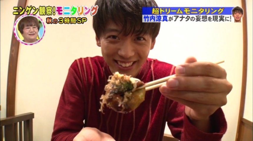 第二個情境是在章魚燒店裡,涼真跑過來跟你併桌,還餵妳吃章魚燒。首先,朋友帶觀察對象到章魚燒店,然後裝要聽電話離席。就在這個時候,竹內涼真特意坐在觀察對象的附近,若然觀察對象問「是竹內涼真嗎?」,他就會走過去併桌。這位觀察對象因為受到太大衝擊,不斷手震,都吃不了章魚燒。於是涼真就說:「妳有試過這款口味嗎?要試試看嗎?」貼心的涼真還把章魚燒切開一半,「呼呼」吹了一下,才餵觀察對象。她說這已經是人生的高潮,現在去死也沒關系!