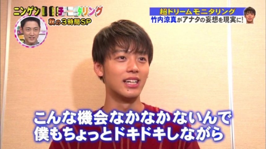 竹內涼真是近期最紅的年輕男星之一,因為性格討好、外表出眾,不同年齡層的女性都很喜歡他。今個星期,他終於有機會參演《ニンゲン観察!モニタリング 秋の3時間SP》,為不知情的女性帶來夢幻時光!