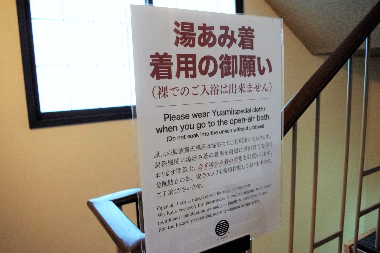溫泉是最受歡迎的日本體驗文化之一,但不少外國遊客都對於在他人面前脫光光感到拘謹。即使是男女分浴,裸體只會被同性看到,也會感到尷尬。不過,現在有些溫泉竟然規定入浴必須穿著「湯あみ着」(入浴服裝)。位於長野縣的溫泉旅館「萃sui-諏訪湖」裡,指明要客人穿著「湯あみ着」到露天混浴溫泉,絕對不能裸體。原因是很多客人在意異性的目光,不願意裸體混浴。
