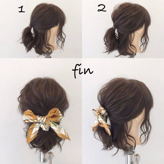 上一張圖片的造型的變化版,把已經用絲巾綁起完成的髮辮造型再加以利用。首先把髮辮拉起,稍微弄得更蓬鬆一些後,把它束成丸子頭後使用髮夾固定。然後可以戴上帽子等作點綴。