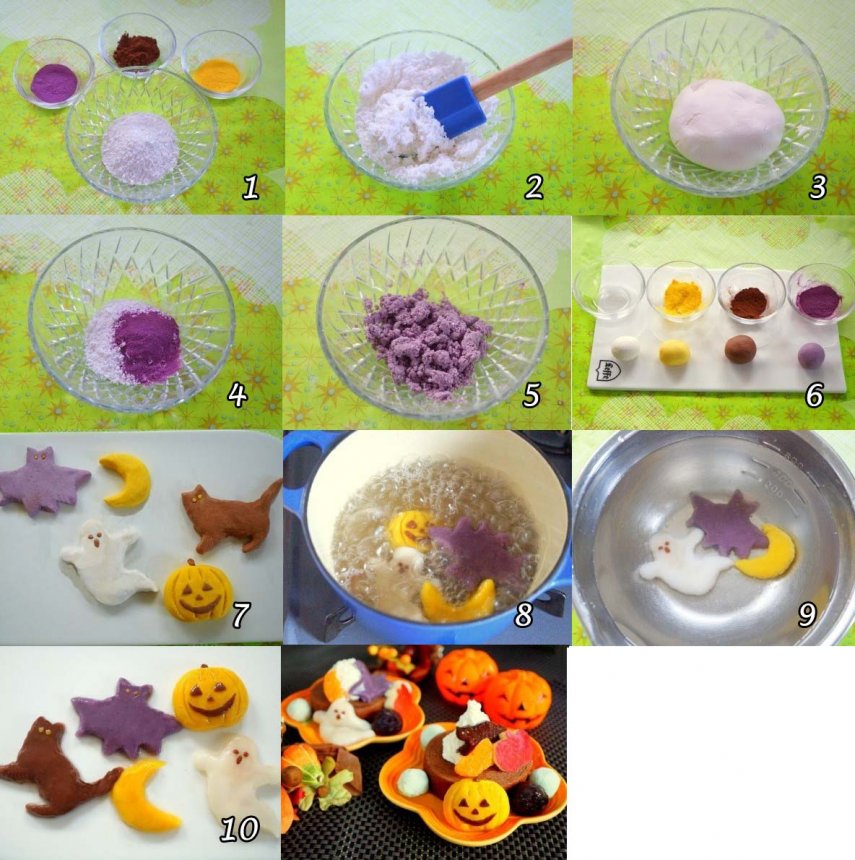 材料有白玉粉、南瓜粉、紫薯粉、可可粉和水。先製作普通的白玉:白玉粉(10g)加水(8g),大概就能做到直徑3.5~4cm、厚度1cm的白玉兩個。無論做多少個都好,只要維持白玉粉與水的比例是10:8就可以了。慢慢搞拌白玉漿,讓它變成第三步的團狀。有顏色的白玉做法與普通的一樣,只是另外加了2g的有色粉,如南瓜粉。當準備好白玉團後,就可以搓成喜歡的形狀,例如是南瓜、鬼、月亮等。最後,把白玉放進沸水裡煮一分鐘,就可以過冷河。只要把萬聖節白玉放在甜品上,馬上充滿節日氣氛。