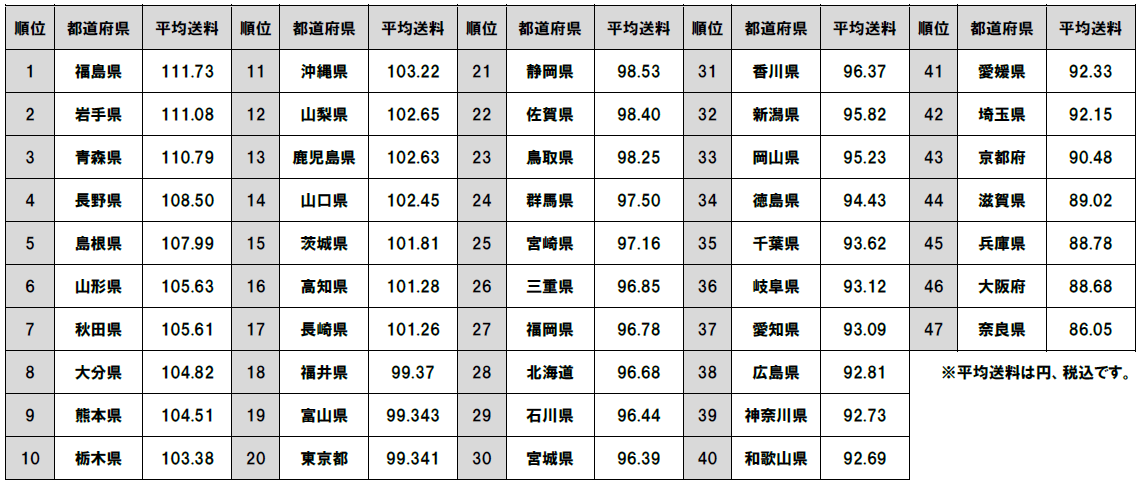 願意付出最多運費的是福島縣(111.73日圓),其次是岩手縣(111.08日圓)及青森縣(110.79日圓)。同為東北地區的山形縣及秋田縣亦在第6及第7位,東北地區之中只有宮城縣的排名較低,是第30位,運費平均為96.39日圓,仍略高於全國的平均值。
