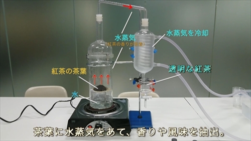 透明飲品利用蒸汽蒸餾法,水蒸氣通過茶葉,將香氣蒸出,當這些含有香氣的水蒸氣通過冷卻管道後,便會成為液體。於是,透明的液體就擁有紅茶香濃的味道。這是最常見的精油提鍊方法,所以SUNTORY以「高濃度アロマ抽出製法」(高濃度精油萃取製法)命名。