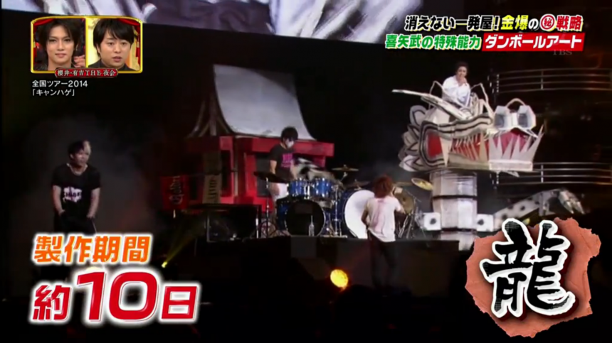 最後,樂隊裡最瘋狂的喜矢武豊,曾參與不少舞台劇和日劇,正向演員之路進發。而且,演唱會上的紙皮藝術品都出自喜矢武的手,例如巨龍、戰車等等,每一款都很好看,難以想像是用紙皮做的。