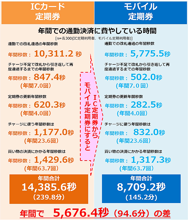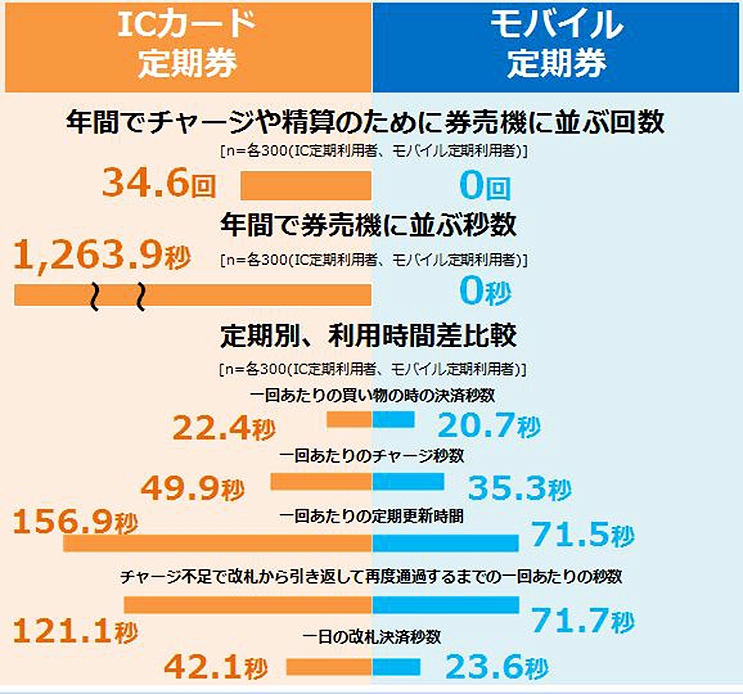 接著,是使用IC卡定期券跟手機定期券的乘客所花的時間的比較。日本不太流行為IC卡自動增值,大部份的使用者都會自行到售票機排隊增值。兩間研究所在追加調查中,訪問了IC卡定期券使用者及手機定期券使用者各300人,發現前者每年平均要到售票機增值34.6次,排隊的時間約為1263.9秒,也就是大約20分鐘。另一方面,在購物和增值時,使用手機付款也比IC卡快。至於到票務處更新定期券所花的時間,使用IC卡的話,也比使用手機付款所耗的時間多出一倍。