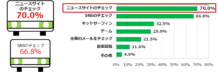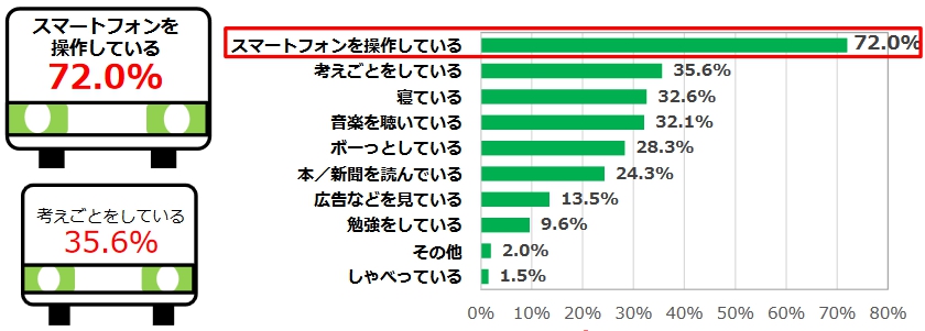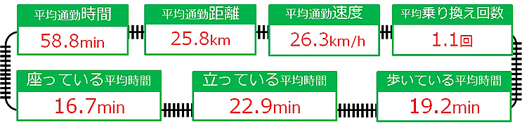 受訪者每天平均花58.8分鐘上班,乘車距離為25.8公里。在這接近一小時的通勤時間當中,有16.7分鐘是坐著的,22.9分鐘是站著的,另外19.2分鐘是在走路。在乘車時,受訪者多數會使用智能手機,看新聞和社交網站。大部份的受訪者都購買了定期券來通勤,一次購買6個月的受訪者最多,佔68.3%。有85.1%使用IC卡版本定期券,10.8%使用手機支付版本,每月平均車費為15170.8日圓。