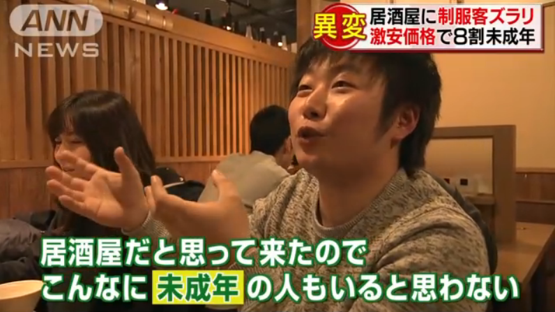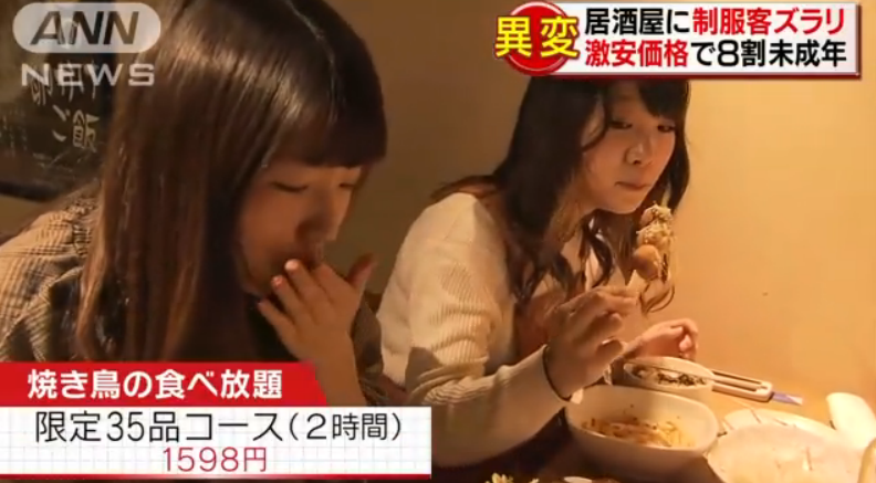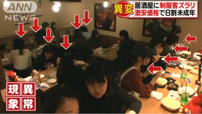 朝日電視台在12月5日報導,在居酒屋發生異常現象,高達八成的顧客都是未成年學生。在普遍人的理解中,居酒屋是大人飲酒、吵鬧的地方,不適合未成年光顧。未成年而又沒有經濟能力的學生,應該去快餐店、家庭餐廳等地方,又怎會有人想到「居酒屋」已經成為女子高中生們的潮流指標之一。