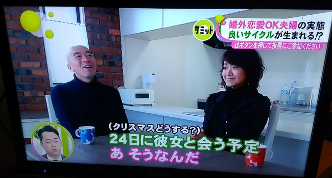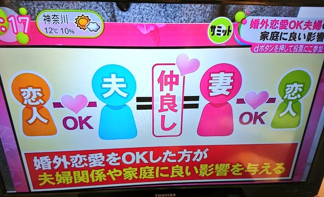 早兩天,不少網民在Twitter說「一大清早說這些,真的好嗎?」其實他們在說富士電視台的晨間節目《ノンストップ!》,介紹一對正在享受「婚外戀愛」的夫妻。在結婚七週年的時候,妻子(50歲)提出想要婚外戀愛,同時也希望丈夫能去找一位女性陪伴自己。最初時,丈夫(48歲)反對這個提議,表示不想感到罪疚。經過兩夫婦多次對談,終於達成共識「只要四人都幸福就好了」。今年夏天開始,丈夫與一位三十歲左右的單身女性交往,而四人都清楚婚外戀愛的玩法,總之不能影響夫婦的感情。