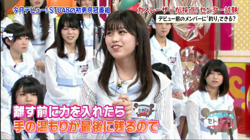 然後,STU48裡最年長的佐野遥說,她一直都遵從歷代釣師的握手傳統,在粉絲離開前用力握手,希望留在粉絲手心的溫暖能夠讓他下次再來握手會。雖然這一個技巧的確會令粉絲心動,不過釣師可不是這麼容易就能當,還要有超人的記憶力呢!