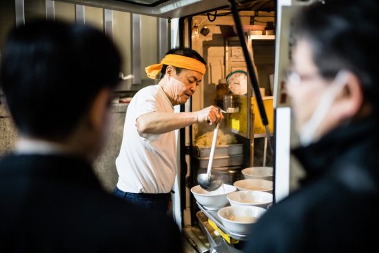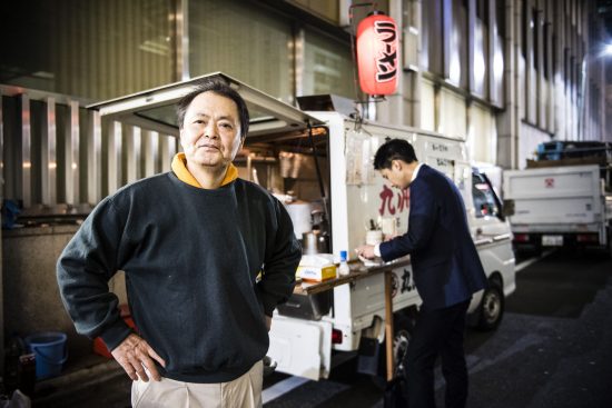去年,雜誌《日刊SPA!》訪問了一位在八重洲賣豬骨醬油拉麵的屋台老闆・田中幸男(68歲)。田中先生經營屋台28年,去年是最後一年擺攤。他說在27歲時辭工並自立門戶,結果公司破產,還欠下4000萬円的債務。身無分文的田中先生回到鹿兒島的老家,遇上好心的拉麵店老闆傳授他秘方。於是他把這個家鄉的味道帶到東京,不知不覺已經做了二十多年。在他擺攤的這段日子,不少上班族都會來光顧,又會替他打氣,給多一點小費。同時,也遇過可怕的客人,佔著位置不願離開。雖然政府把屋台視為眼中釘,但屋台老闆沒有破壞環境搞對抗,反而極之注重環境清潔,希望不要帶麻煩給這個地區。田中先生說,「本來我(的屋台)就是礙事的存在,有時還要在附近借水、借洗手間。所以我很重視跟附近的人打好關係,也必定會在開店閉店時清理垃圾。」
