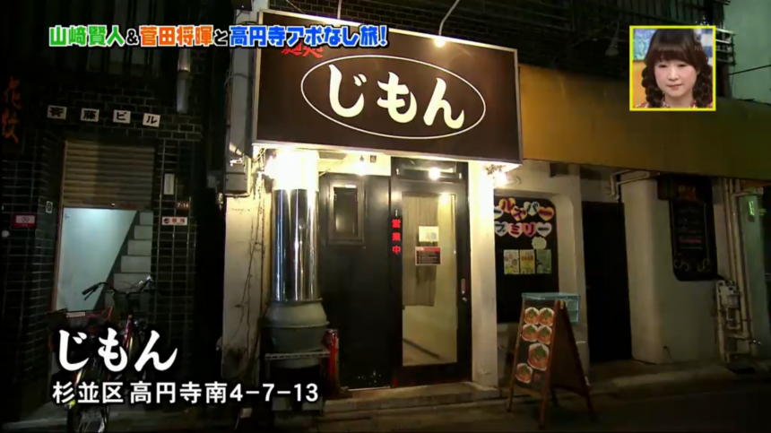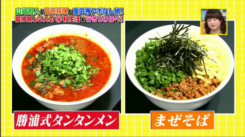 第一間食店是菅田極力推薦的拉麵店「じもん」(Tabelog按我)。這裡最有名的是辣度十足的擔擔麵,客人可以選擇不同辣度,而菅田就建議選「1辛」。山崎自稱很愛吃辣,所以挑戰店主推薦的「2辛」。另外還有「3辛」、「5辛」、「特辛」,據說「1辛」已經相當辣,所以第一次光顧的客人千萬不要高估自己。這間店的擔擔麵的湯底是用辣油炒香的肉碎和洋蔥,加入秘製清湯而成的,是會讓人上癮的香辣湯。另外,主持人瑛士就選了「台湾まぜそば」(肉燥拌麵)。雖然這道料理有「台灣」二字,但其實是名古屋料理來的。一般的肉燥拌麵都會放上韭菜、蔥、魚粉、肉碎、蛋黃和蒜粒,而這裡的就多了芝士,看上去非常美味。