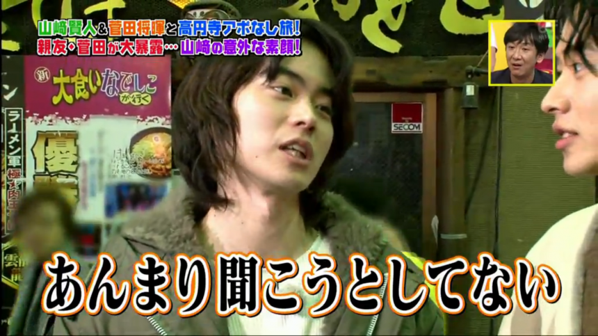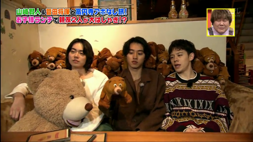 山崎賢人主演的冬季日劇《致命之吻》大受好評,日前他與好友菅田將暉一同在節目《火曜サプライズ》上宣傳劇集。節目中,菅田帶主持人瑛士和山崎一起在高円寺尋找美食。與好友一同拍節目的山崎,感覺上很放鬆,不斷表現天然呆的一面。
