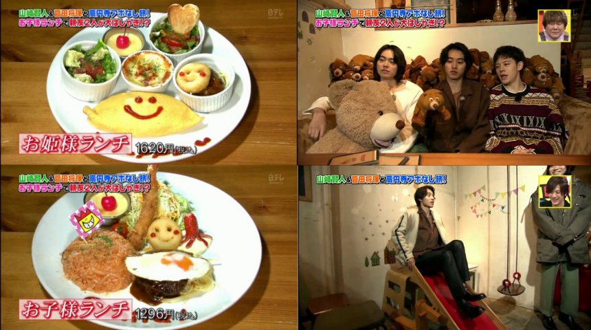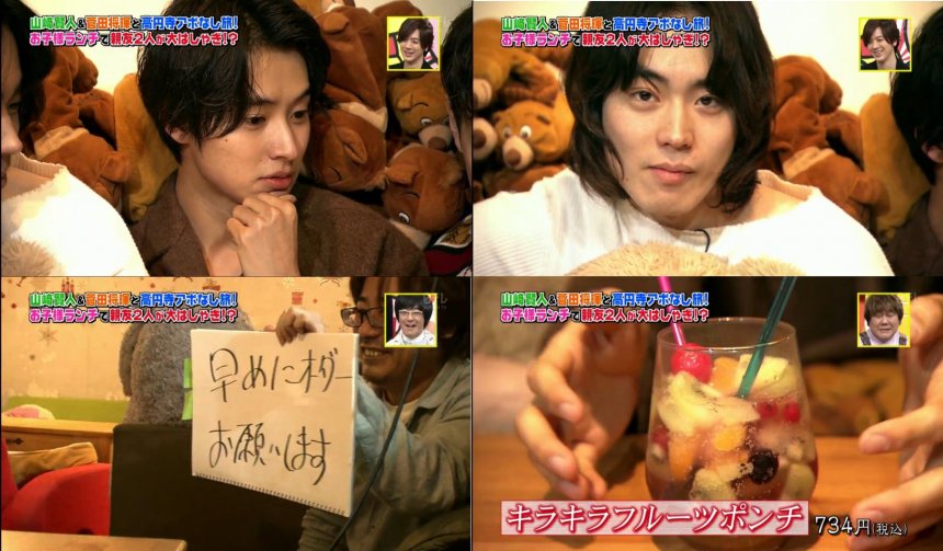 咖啡店內環境舒適,有不少玩偶陪伴客人用餐。因為吃完拉麵已經有點飽,他們就點了兩款兒童餐分來吃。山崎在決定吃什麼時,苦惱了很久也沒有答案。在工作人員催促之下,他才點最想飲的Fruit Punch。在旁邊等待的菅田擺出不耐煩的樣子,超有戲的(笑)