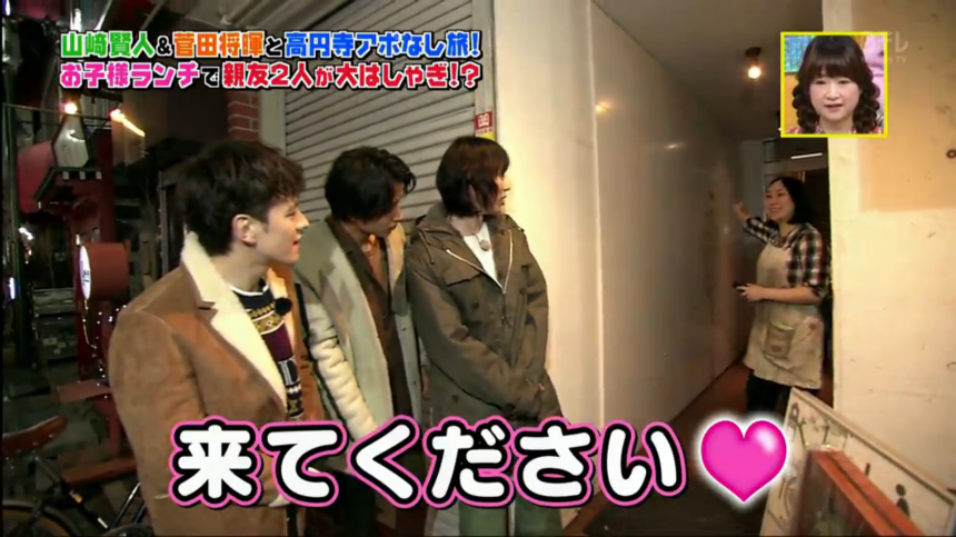 離開拉麵店「じもん」後,因為菅田沒有想到什麼好餐廳,於是三人就開始在街上問人哪裡有美味的料理。山崎被委派做代表去問途人,但他說自己不擅長與人溝通,最後還是由菅田問。看著他們的互動,真的很容易會想歪……菅田指有時山崎會在發呆,沒有聽人說話,所以有時會重複別人剛剛已經說過的事情。果然是多年交情的好友,超級清楚對方的習性!