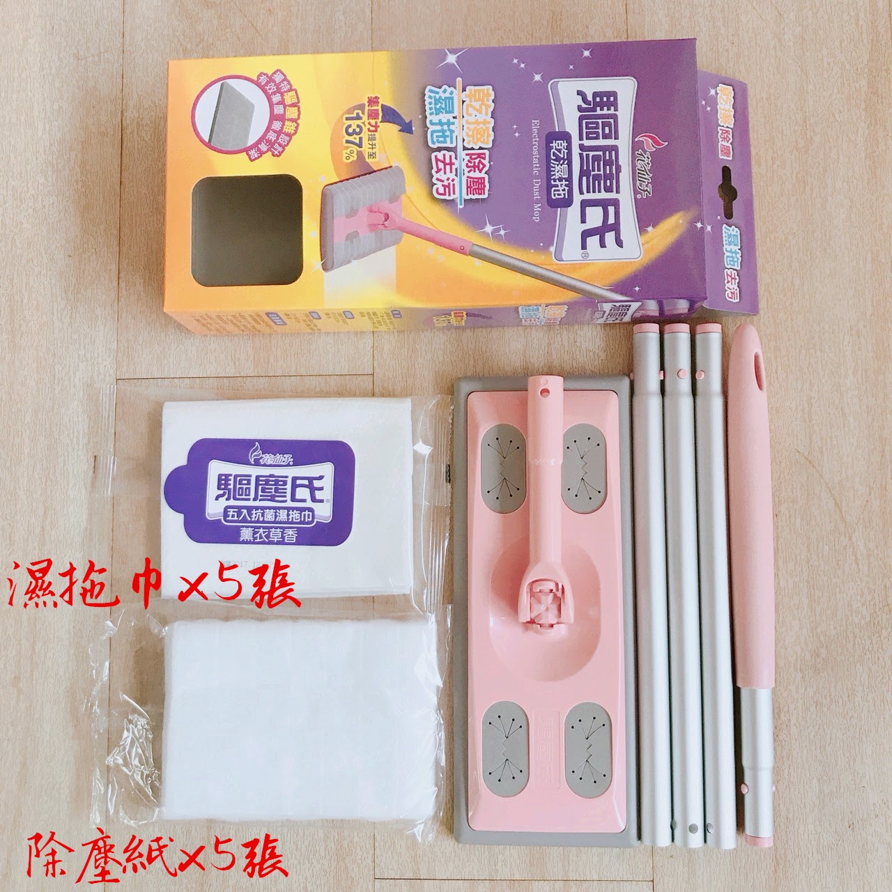 因為這支《驅塵氏乾溼拖》是拆卸組裝式,所以占用的空間也不大蠻方便的,一開始買的盒中就會附上5張除塵紙以及5張濕拖巾。