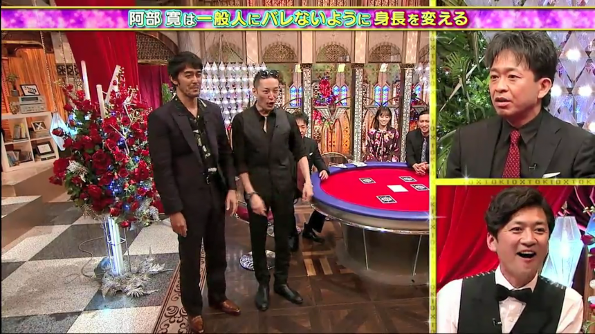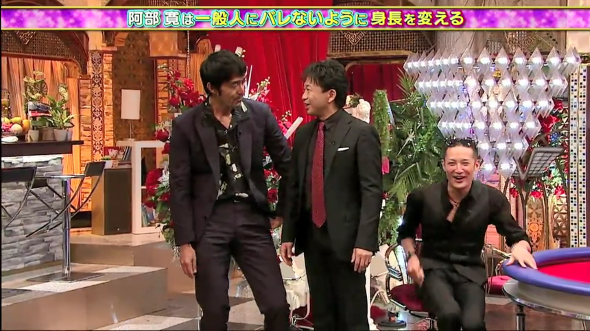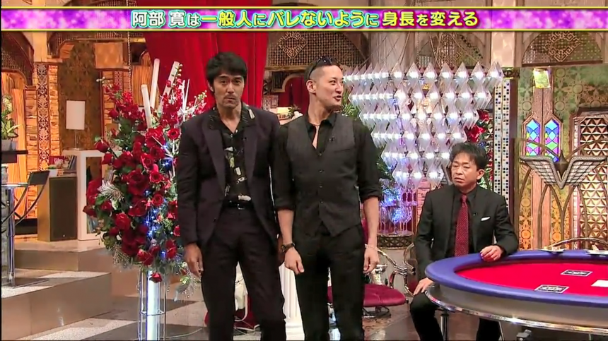 阿部寛在富士電視台節目《TOKIOカケル》被問及出門的偽裝方法。阿部說自己的體格太顯眼,戴口罩和帽子都於事無補。於是,他開始練習降低自己身高,包括屈膝走路和站立時傾向一側。現在的阿部伸縮自如,不論站在181cm的松岡昌弘旁邊,還是170cm城島茂的旁邊,都非常自然。