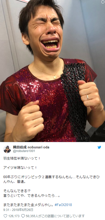 近日,他在Twitter發文說「羽生結弦實在太勁了!那傢伙不是一般的厲害!暌違66年衛冕奧運金牌的溜冰選手,一般人根本不可能做到啊。真的能做到嗎?如果能做到就事先跟我說啊。又再又再又再又再奪得金牌。」網民都說織田比原圖的中西隆裕氣勢更強,顏藝更好笑。