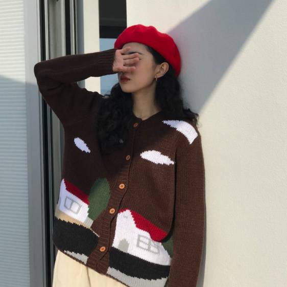 復古田園的簡單圖案讓原本古板的棕色毛衣變得好溫馨可愛!一看到便讓人擁有好心情的單品,很適合公園野餐、戶外踏青活動時搭配~扣子全部扣上、或是隨性地披在肩上都很迷人。