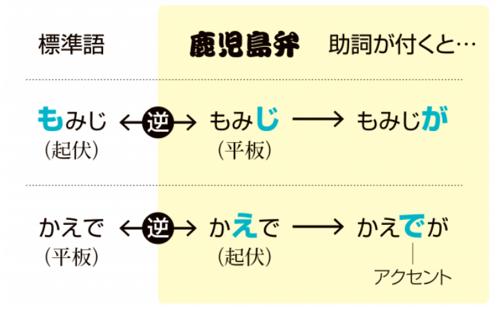 讓鹿兒島弁聽起來難解的另一個原因,是因為其高低音(アクセント)與標準語是正正相反。標準語高音的地方,鹿兒島弁則低音,反之亦然。加上,高低音會因為加上助詞而出現變化,這個特微也是在其他地區的方語中十分少見。