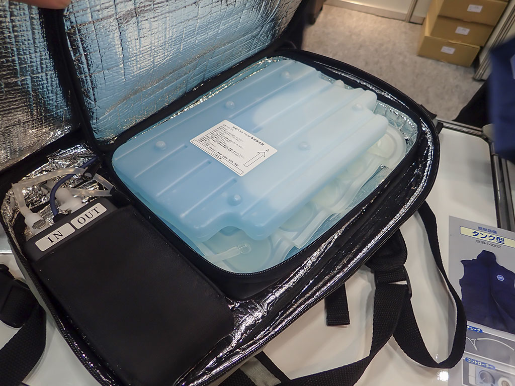 背心冷卻的原理其實很簡單,就是由小管注入冷卻液,流遍背心後回收到外部裝置冷卻。另外背心的材料是採用容易吸汗和散發的,令皮膚能保持在舒適的狀態。至於外部冷部的方式有三種︰標準的「冷卻庫型」,以冰和製冷劑去降溫;方便移動的「背包型」;以及這次新參展,接駁外部電源以便長時間工作的「冷卻器型」。