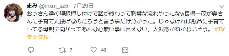 「給孩子玩手機」不是一件好事,大澤自己也知道的,她有在反省。長嶋與子女的關係不特別好,讓妻子一人負上育兒的責任,卻公然在節目上教女性如何當母親,任誰都覺得奇怪吧?