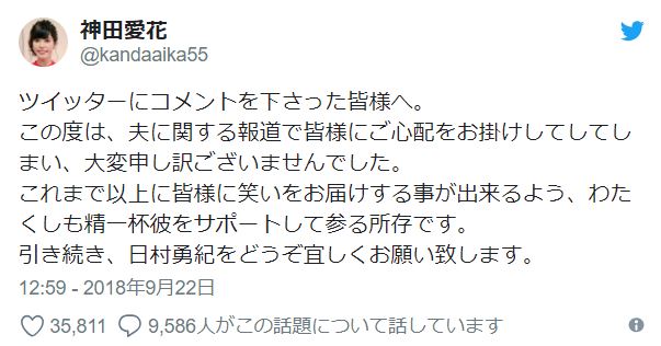 新婚不到半年,丈夫就爆出醜聞,許多人都擔心神田愛花。昨天,神田終於更新推特,「在推特留言的各位。這次有關丈夫的報導讓大家擔心了,真的非常抱歉。為了今後可以帶給大家更多的歡笑,我會盡力支持他,希望大家都可以繼續支持日村勇紀。」粉絲都稱讚神田大方得體的回應,還說她是最好的妻子,會一直為他們夫婦打氣。