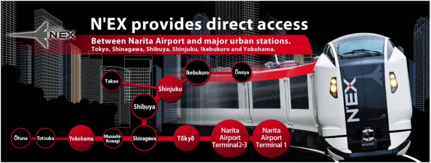 成田特快N'EX連結成田機場及東京主要車站如東京站、品川、渋谷、新宿、池袋乃至橫濱等,約53分鐘到達東京站,全車皆為指定席。
