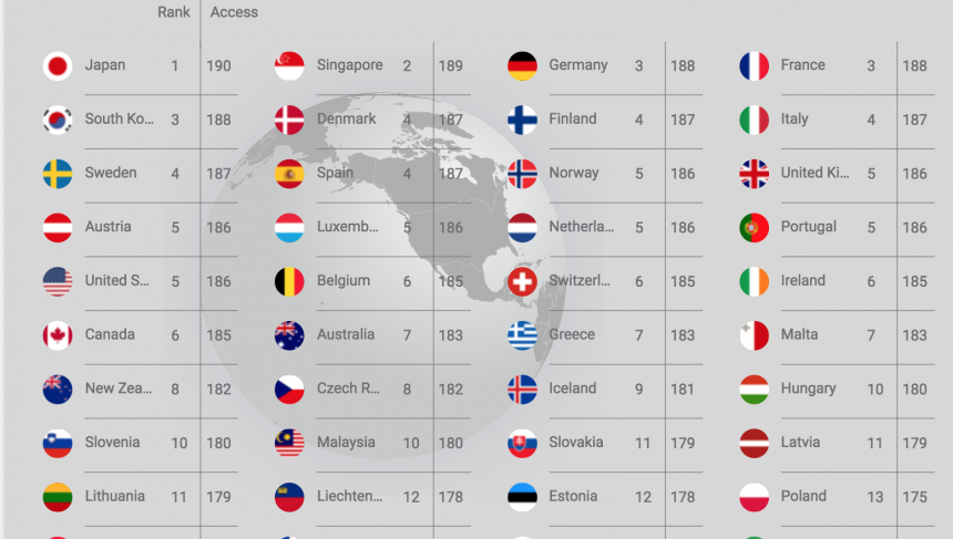 據國際航空協會(IATA)以199個國家或地區的護照為對象的數據,日本的免簽或落地簽國家或地區在今年2月與新加坡並列為189個。