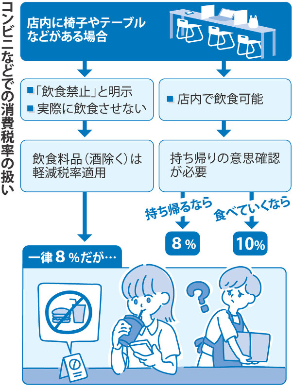 日本部份大型便利店內,設置休息的空間,讓客人在店內吃便當和小食。不過,當增稅政策實施行,便利店就有點尷尬了。如果客人在店內享用商品,店員就要收取10%消費稅;如果客人離開商店才享用,店員就要收取8%消費稅。