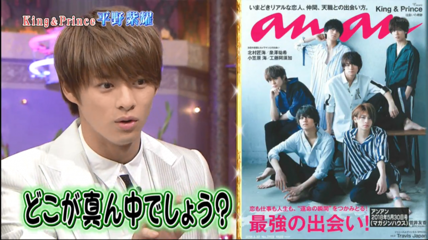 翌日播放的綜藝節目《閒聊007》,又有平野的天然片段。King & Prince在出道日登上女性雜誌《anan》的封面,主持人問平野「中間的是你?」平野竟然問,「哪裡是中間呢?」這個回應讓主持叔叔們都哭笑不得,德井義實還替他說話,「對角線的交差點就是中間,所以嚴格來說平野不在中間。」