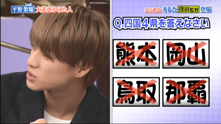 平野自爆學生時代的成績不太理想,基本上都考不多於10分。後來升上高三才急起直追,每科都考得90分以上。有見及此,主持人來個突擊測試,叫他說出四國四縣的名稱。平野竟然全錯,還要搞錯山岡縣的名產,讓大家都很無奈。那些不是粉絲的觀眾看完節目,在推特吐槽「沒想過平野紫耀這麼笨,不過很可愛所以算吧」。