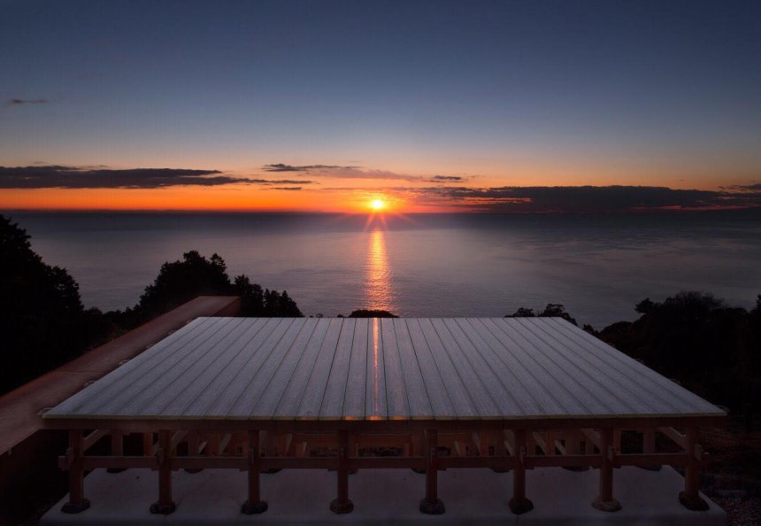 而當中我最期待、想親身體驗的便是「冬至光遥拝隧道」及「夏至光遥拝藝廊」,兩條宛如隧道一般的長型空間中有著截然不同的空間氛圍。「冬至光遥拝隧道」兩側被黑暗的空間包圍,宛如參拜世界起源一般,當冬至的時候可看見日光從遠處海面水平線上升起,「夏至光遥拝藝廊」則是以37面全透明玻璃製作成一條長型藝廊,盡頭也可眺望相模灣的海平面,令人期待夏至時當日光充滿著整條長型藝廊時,會滿溢出多麼懾人的光芒。(初期將展示杉本博司的「海景」系列攝影)。杉本博司甚至將千利休所設計的茶室「待庵」以原尺寸再現於此設施中,並命名為「雨聽天」。(音同於「有頂天」,佛經中代表至高無上的天界),春分與秋分的日出時,第一道日光將沿著茶室前的「石舞台」,從茶室玄關入口射入,空間充滿自然的能量。大地從冬至開始,循環至春分、夏至、秋分,藉由還原古時人類在自然裡感受四季的體驗,重新檢視何謂「美」?而這也是他定名此美術空間為「測候所」的原因。
