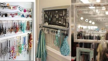 這是個多麼聰明的方式來顯示你的首飾!舊畫框裱上和牆面相同顏色的毛氈,用針固定你的首飾,然後你會得到很酷的一件藝術品,並可輕易地選擇今天要穿戴哪一個。