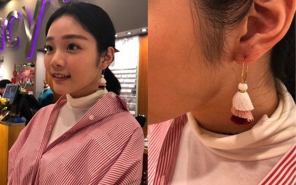 飾品選擇了和服裝同色系的多層次粉嫩流蘇耳環,幫上半身點綴更多份量和重點!