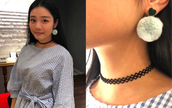 飾品用蒂芬妮綠的愛心絨面毛毛球和頸鍊搭配,超有氣質的一套絕對能勾走男生的心~