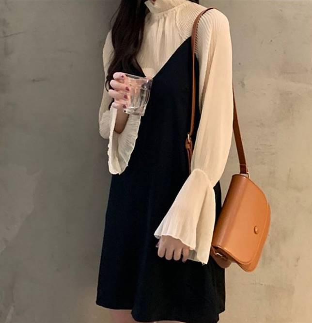 如果擔心穿上連身洋裝身型會顯得臃腫,那就可以選擇這種裙擺有設計感的連身洋裝!再利用背心裙的多層次穿搭,裡面內搭短袖或薄長袖上衣,就會顯瘦許多~裙擺設計可以說是在臃腫冬裝中可以讓你輕鬆顯出纖細身形的小秘訣唷!
