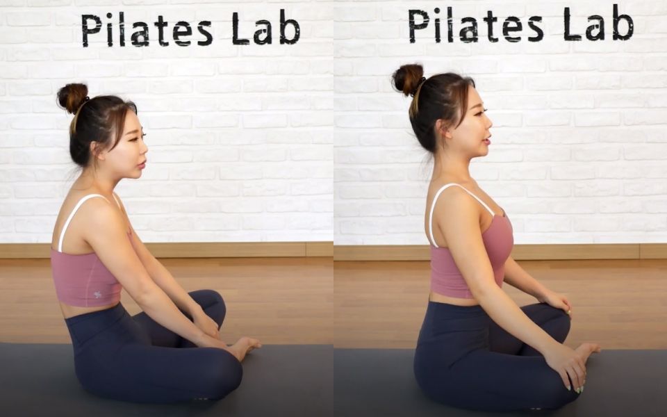 首先就是先盤腿坐,這邊先注意坐姿,頭、肩膀、背部、臀部要維持一直線,想像頭頂有一條線拉住,像左邊駝背就是錯誤示範。