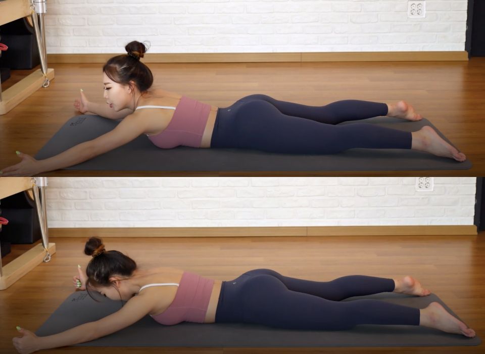 另外就是一個矯正內縮肩、駝背的動作,首先先正面向下趴在地上,雙腳、雙手打開比肩膀寬約一半的距離。