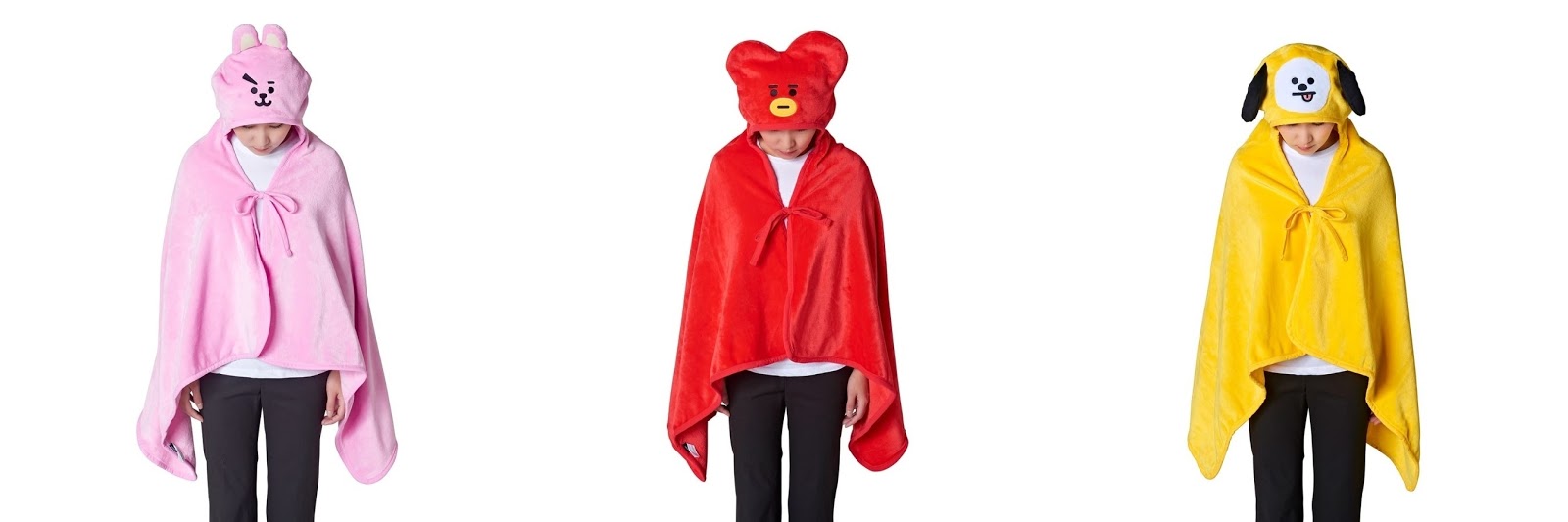 由LINE與防彈少年團聯手設計的BT21角色推出的連帽毯超可愛!帶去辦公室在冷氣房披著或是午睡時使用絕對能一掃工作的疲累,療癒度破表,BT21角色套頭帽不管是大人小孩看到都絕對想擁有!