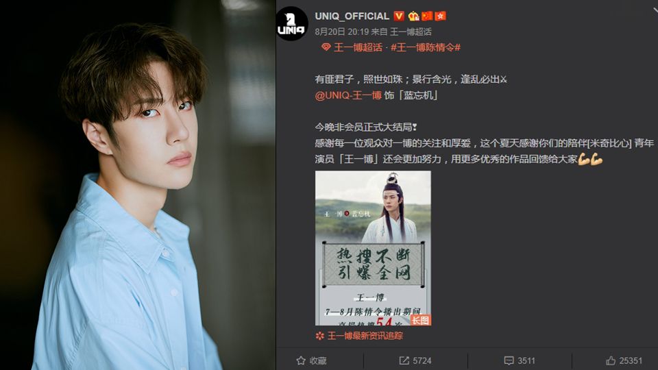 王一博官方微博在發《陳情令》大結局感謝文時,也附上「有匪君子,照世如珠;景行含光,逢亂必出」,《有翡》原著小說為《有匪》,讓粉絲猜測是在暗示。