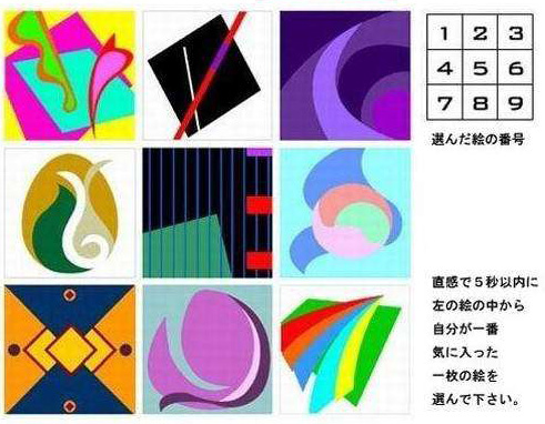 問題:用五秒時間,從下列九張圖像選一個你最喜歡的。(千萬下能超過五秒,否則會沒有效喔!)
