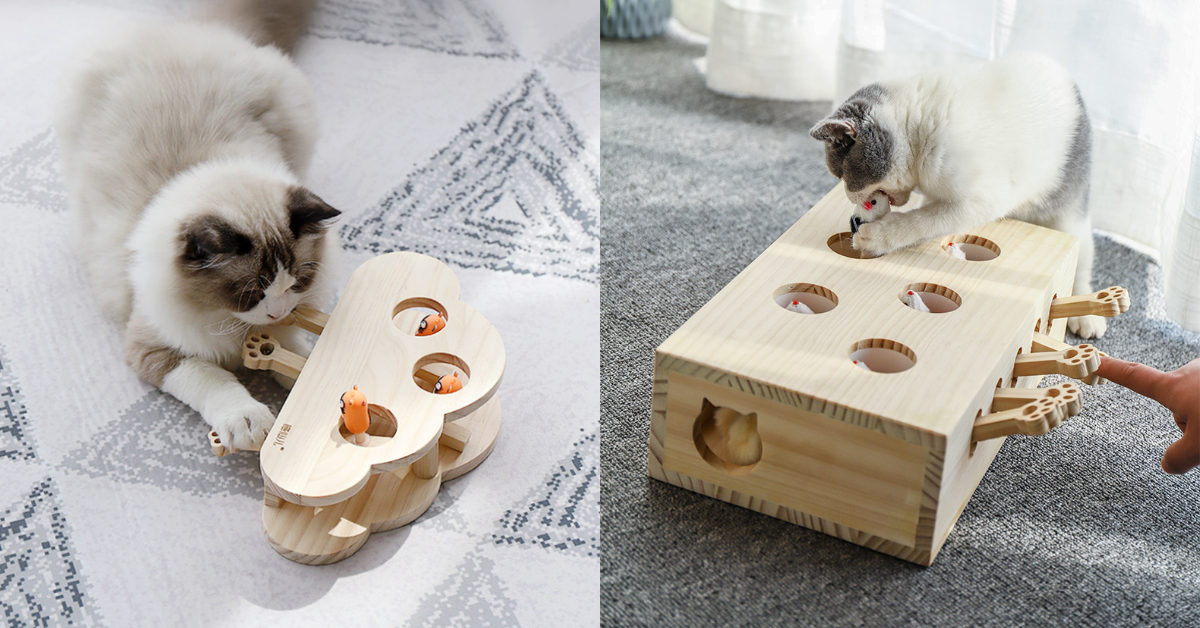 我天,打地鼠竟然有貓咪版!瘋狂打地鼠是一個很好增進主僕關係的一款玩具,旁邊的控制把手可以隨意的和寶貝們互動,無論是要狂按同一個洞或是輪流按都可以,想怎麼整他們就怎麼整~但失控的寶貝們可能會直接跳到盒子上把老鼠從洞裡硬是挖出來(如右圖),總之有老鼠的地方就會有瘋狂的貓咪!