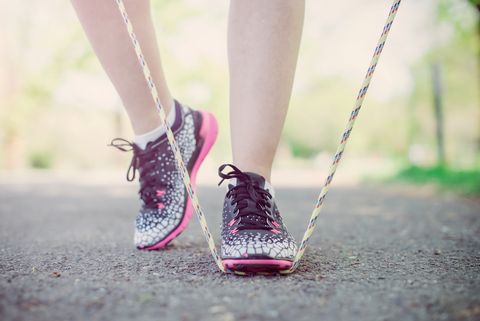 跳繩第一步是留意繩子本身的長度有否過長或過短,量度的方式是雙腳踏在繩子上,拉起繩子至胸口位置的長度為之合適