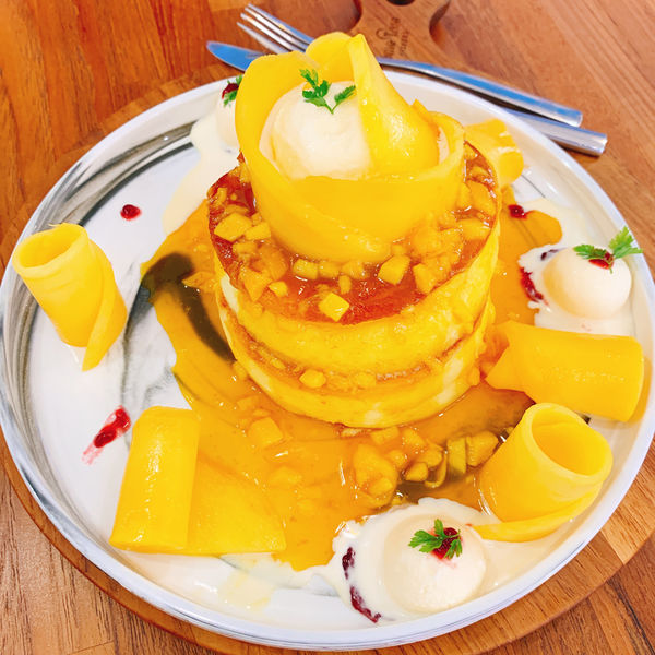 超的舒芙蕾上面鋪上滿滿的新鮮芒果和酸甜恰到好處的果醬,上面放一球香草冰淇淋,讓整個吃起來清爽不膩