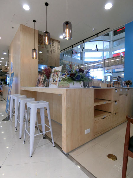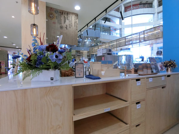 咖啡廳的layout是半開放式的,廚房櫃檯位在中間,櫃台前面有一區用餐空間,面向百貨的大廳廣場