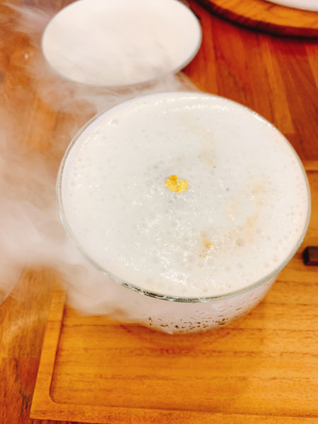 在創意咖啡系列裡面的茶染金栗,用乾冰製造出品嚐咖啡的意境